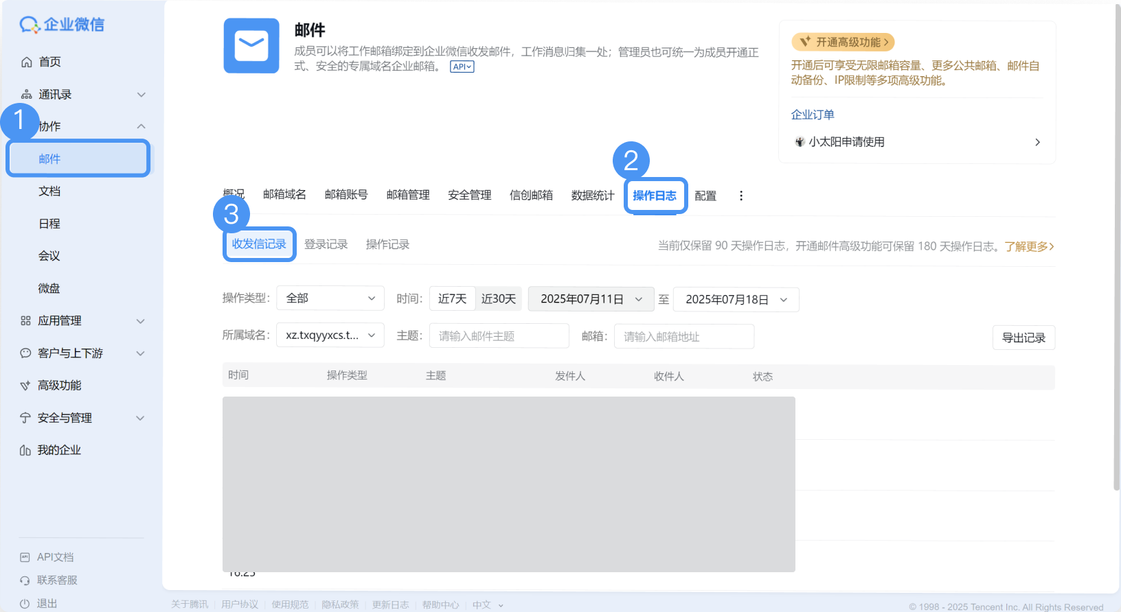 登录【企业微信管理后台->协作->操作日志->收发信记录】支持通过选择时间、成员邮箱账号和类型(全部/发信/收信)组合查询邮件记录以及投递状态。