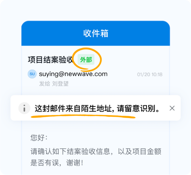 在企业微信邮箱中,如果收到来自公司外部、不是同事发的邮件,邮件标题后会自动带有显眼的「外部」标签。