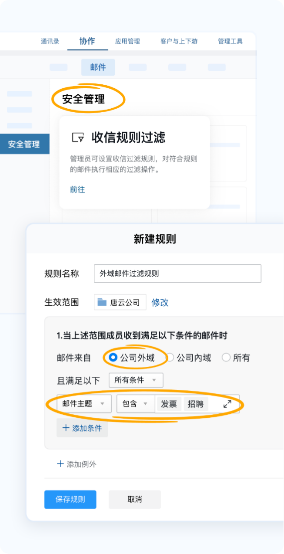 有些企业还希望定向拦截一些邮件:比如拦截“代开发票”等不法广告邮件,拒收竞争对手或者猎头的招聘邮件,对采购部门拒收带有“返点”等关键词的邮件等等。现在,开通邮件高级功能后,管理员就可以根据关键词、IP地址等条件设置「收信过滤规则」,拦截和过滤掉这些风险邮件了。